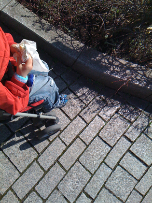 ムスはベビーカーにゆられてグースカ寝てたけど、起きてパンを食べたりおにぎりを食べる。